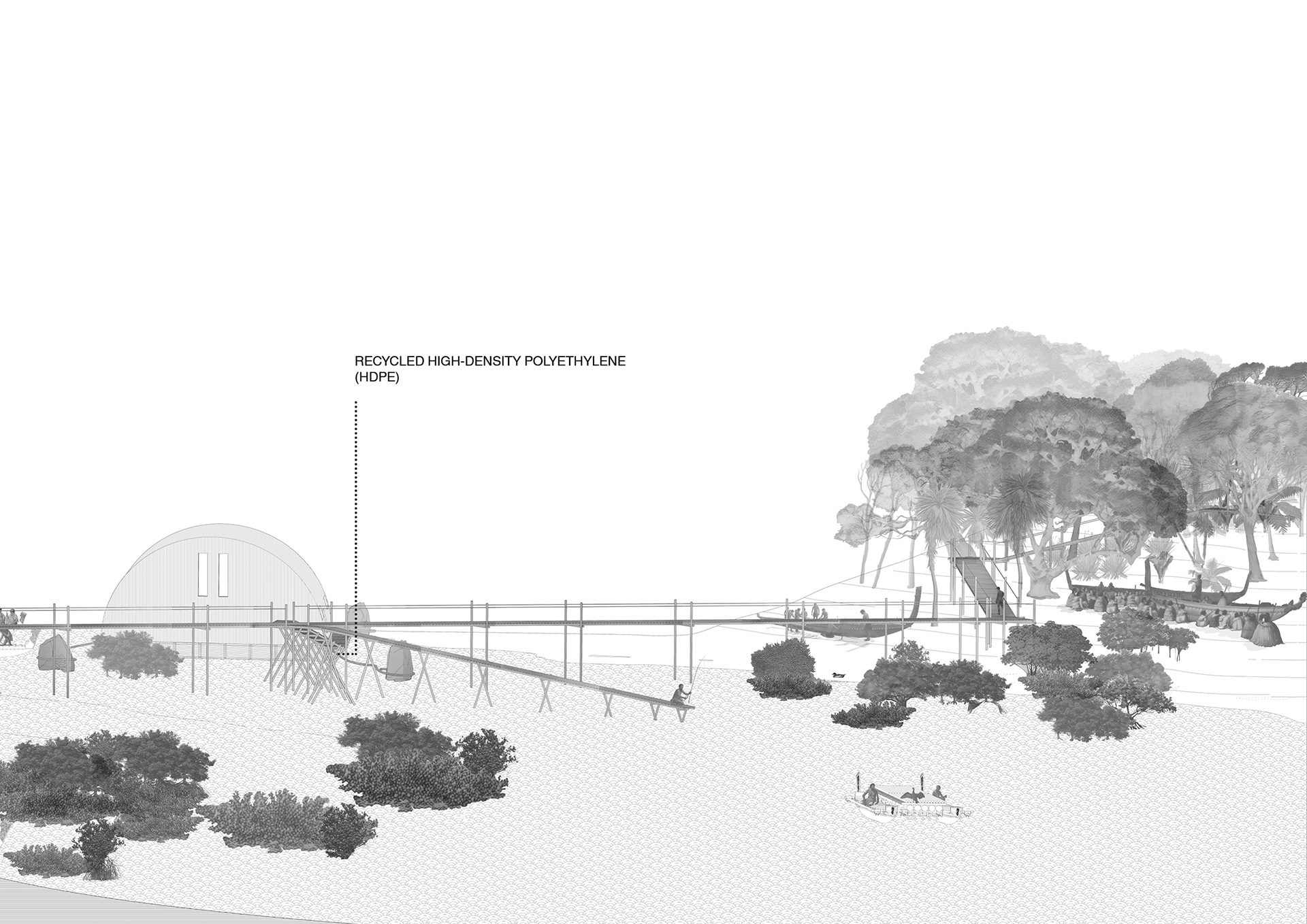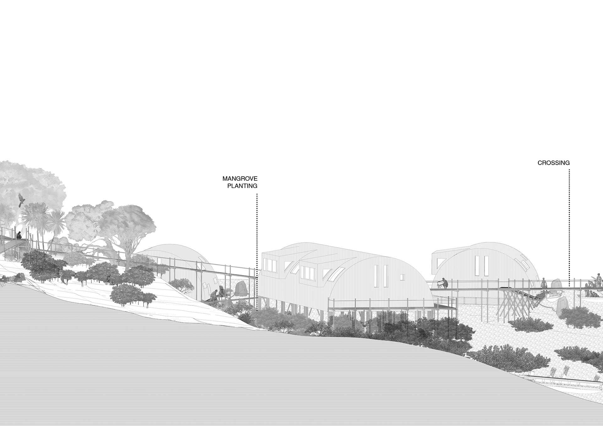 Inspired by site-specific artist Mary Miss. Investigating harmony of vernacular techniques with their surrounds, the black and white image masks what could be an unharmonious pairing of different environments' vernaculars, testing Bernard Rudofsky’s techniques in his ‘Architecture Without Architects’ exhibit, and its tendency to present vernacular building as context-free. Also investigating the potential uses and development on space otherwise deemed 'inhabitable'.
