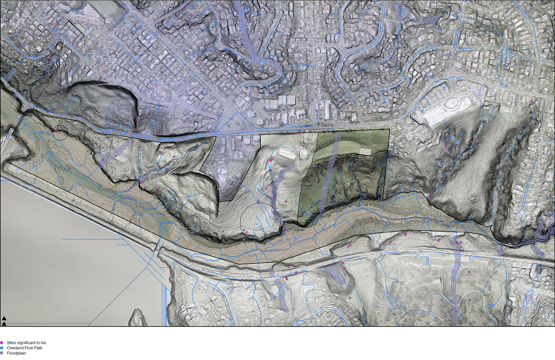 That framework is then projected through a design proposal for a meandering kāinga (traditional unfortified Māori village settlement) at Ngāti Whātua Ōrākei’s Pourewa Reserve, a site constrained with overlapping hazards including coastal erosion and inundation, floodplains, overland flow paths, and unstable soil.