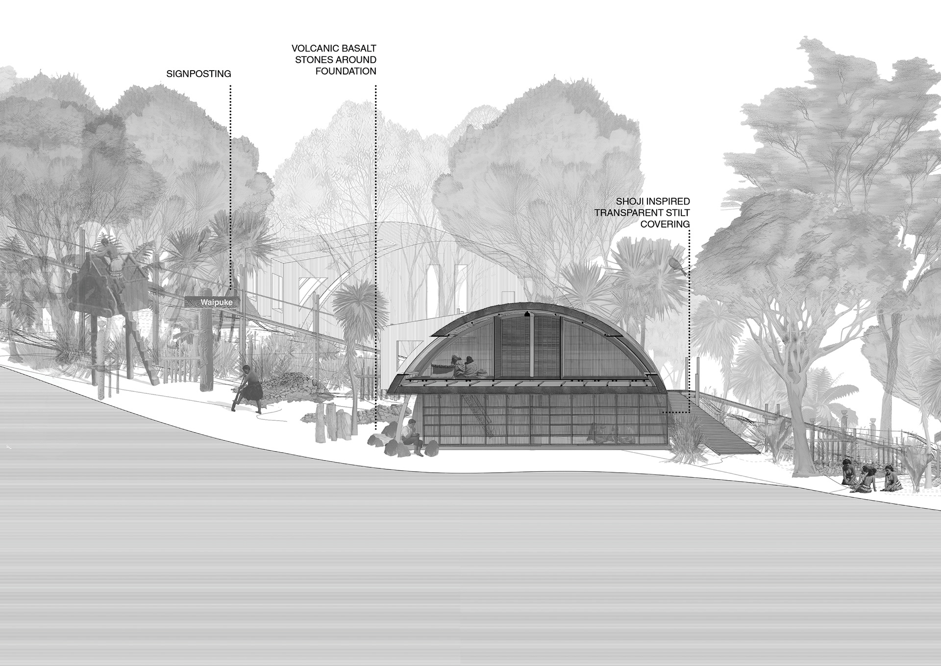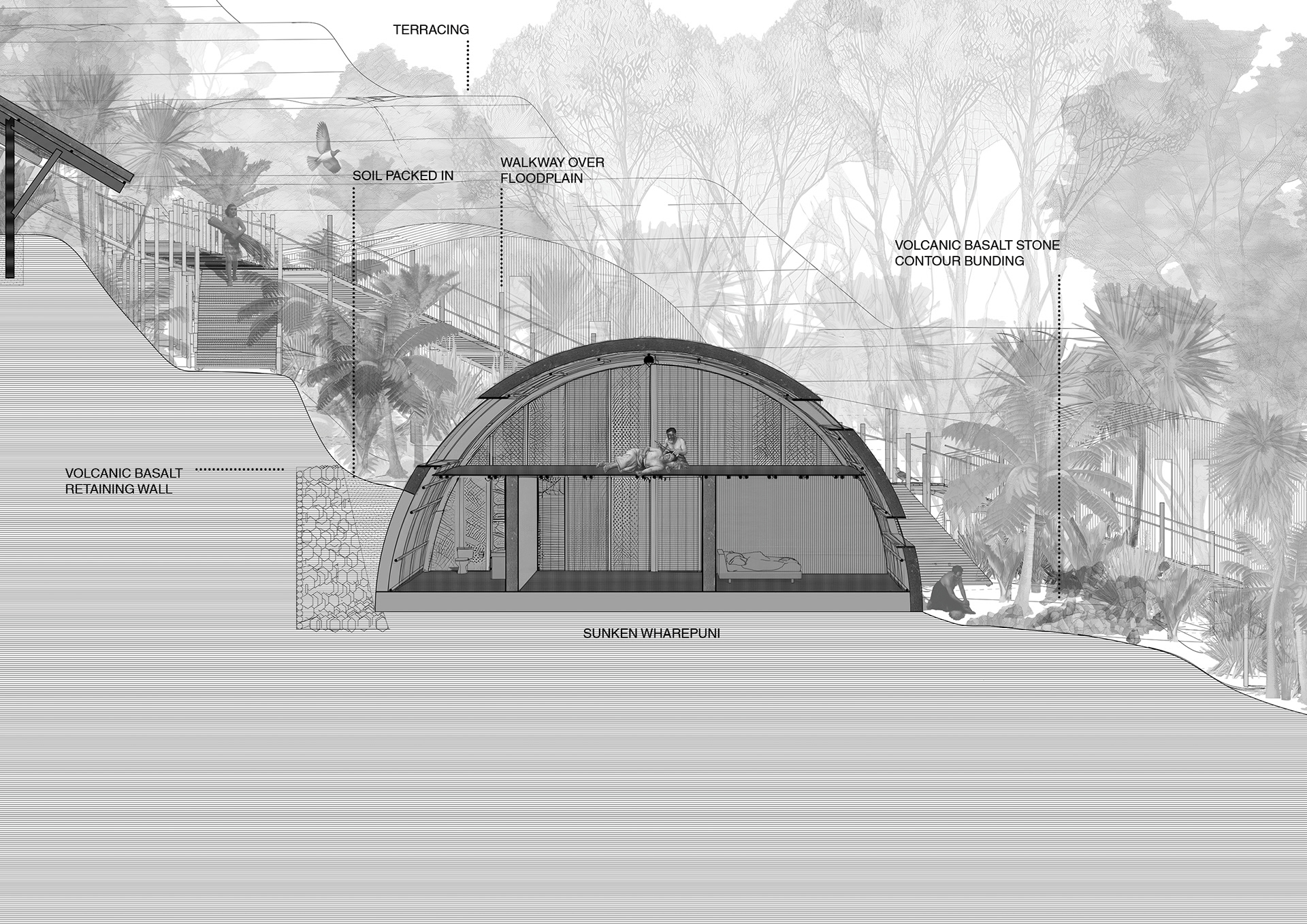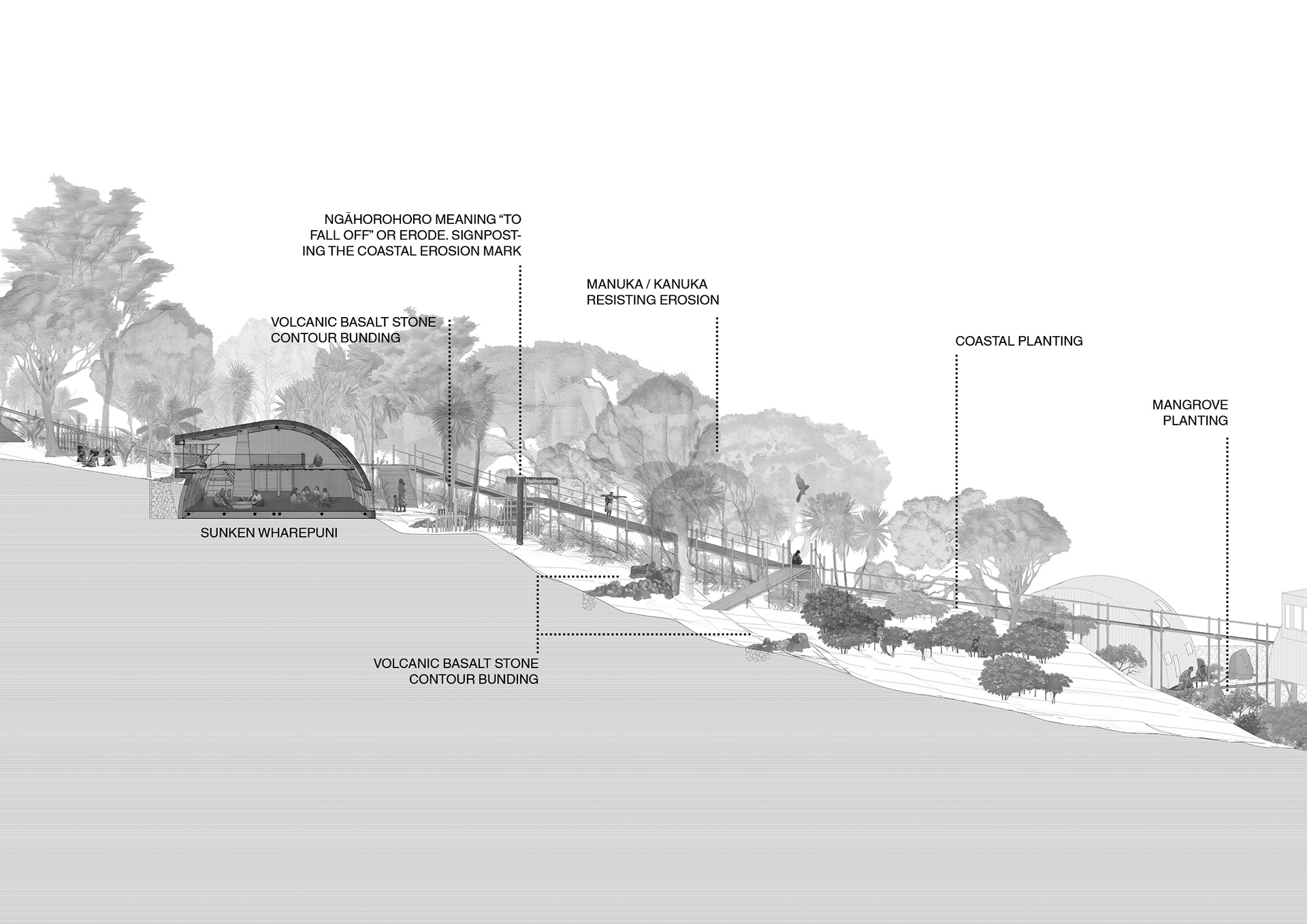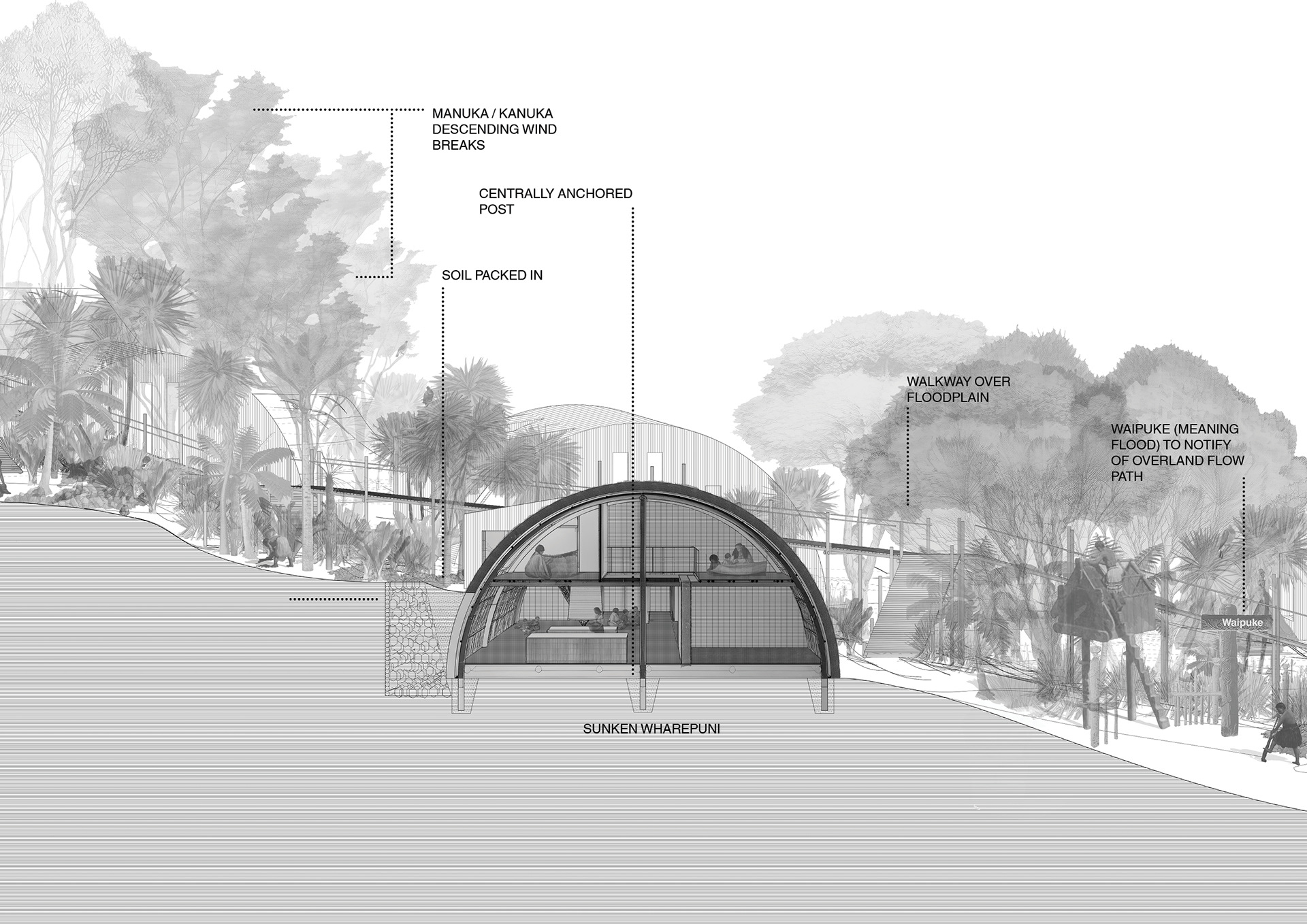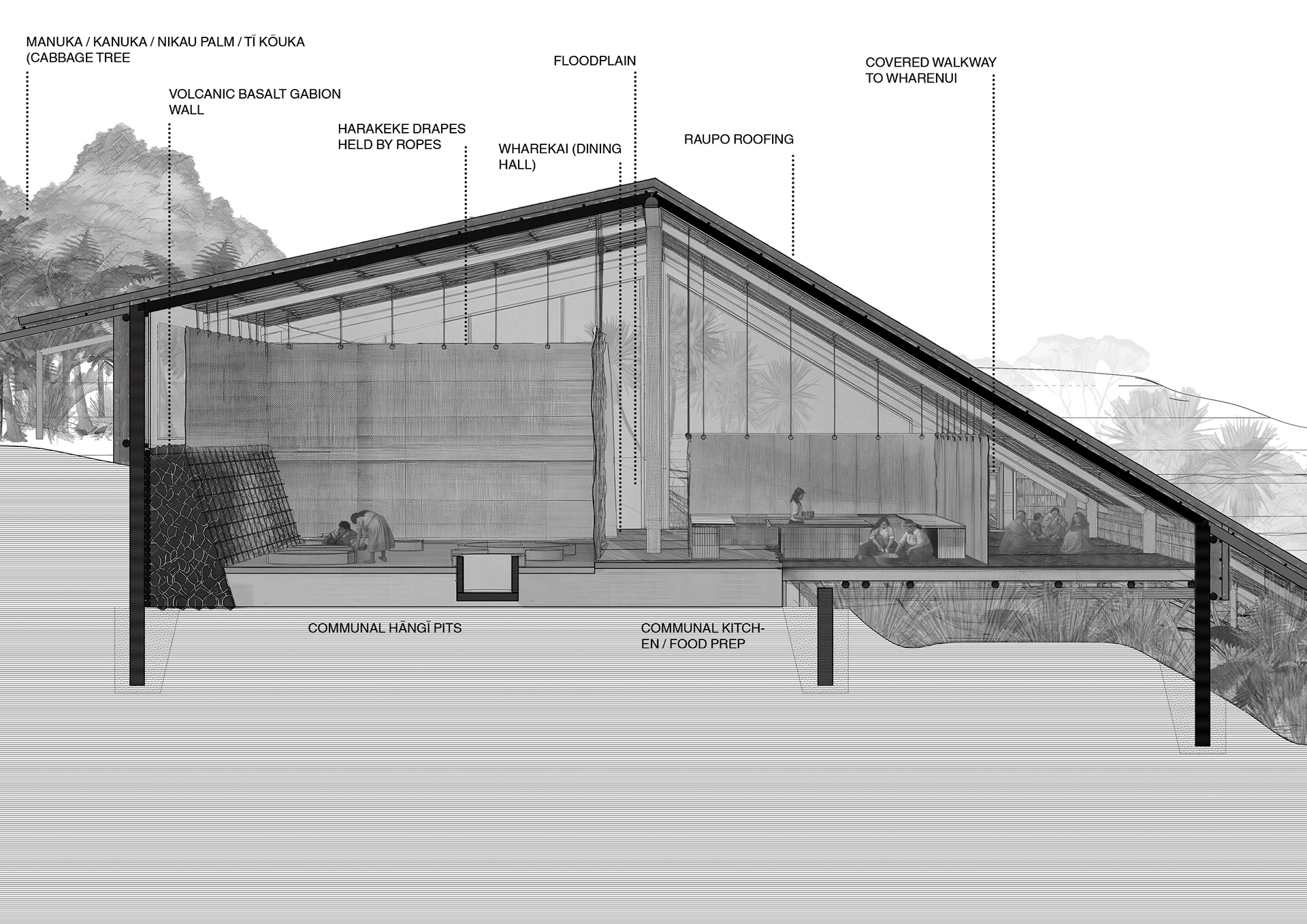 This perspective section cuts through the communal hāngī pits and shared kitchen, with the wharekai beyond, gently separated by harakeke drapes. This space is the social and operational heart of the proposed kāinga at Ngāti Whātua Ōrākei’s Pourewa Reserve where cooking, eating, and gathering coexist amongst a floodplain and overland flow path that passes between the Wharekai and Wharenui, while a single continuous roof unifies both spaces.