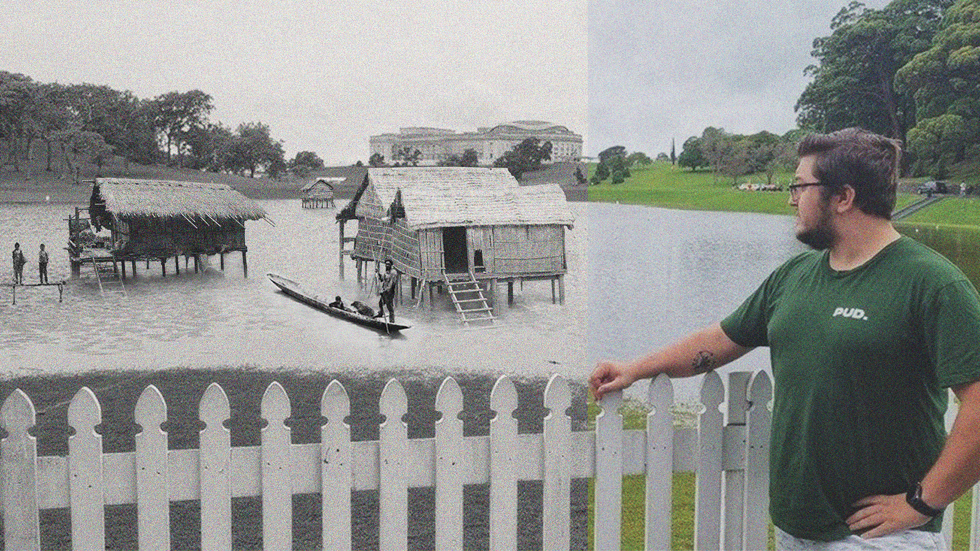 Collage. Juxtaposing stilt houses from Bangladesh with the outcomes of the 2023 Auckland Anniversary Weekend floods. Exploring potential adaptation to climate change in the Tāmaki Makaurau context.